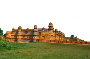 Standing on a steep mass of sandstone, Gwalior Fort dominates the city and is its most significant monument. It has been the scene of momentous events, imprisonment, battles and jauhars . A steep road winds upwards to the fort, flanked by statues of the Jain tirthankaras, carved into the rock face. The magnificent outer walls of the fort still stand, two miles in length and 35 feet high, bearing witness to its reputation for being one of the most invincible forts of India. This imposing structure inspired Emperor Babur to describe it as ” the pearl amongst the fortresses of Hind “.Within the fort are some marvels of medieval architecture. The 15th century Gujari Mahal is a monument to the love of Raja Mansingh Tomar for his intrepid Gujar Queen, Mrignayani. The outer structure of Gujari Mahal has survived in an almost total state of preservation; the interior has been converted into Archaeological Museum housing rare antiquities,some of them dating back to the 1st century A.D. Even though many of these have been defaced by the iconoclastic Mughals , their perfection of form has survived the ravages of time. Particularly worth seeing is the statue of Shalbhanjika from Gyraspur, the tree goddess, the epitome of perfection in miniature . The statue is kept in the custody of the museum’s curator, and can be seen on request