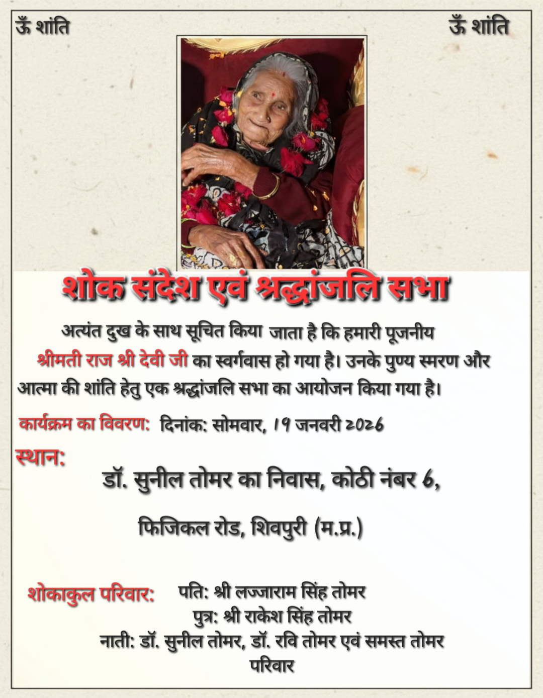 “मां, दादी, और मार्गदर्शक… श्रीमती राज श्री देवी जी (धर्मपत्नी श्री लज्जाराम सिंह तोमर) आप भले ही हमसे दूर चली गईं, लेकिन आपके दिए हुए संस्कार हमारे जीवन की हर राह को रोशन करते रहेंगे।”